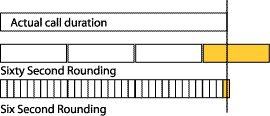 The impact of rounding is relative to the ratio between your average unrounded value and your maximum rounding amount. In the case of telephony with sixty second rounding, the ratio is roughly 3.5 versus 1.0. When you switch to six second rounding, the ratio goes to 3.5 versus 0.1. The following diagram illustrates the impact graphically.